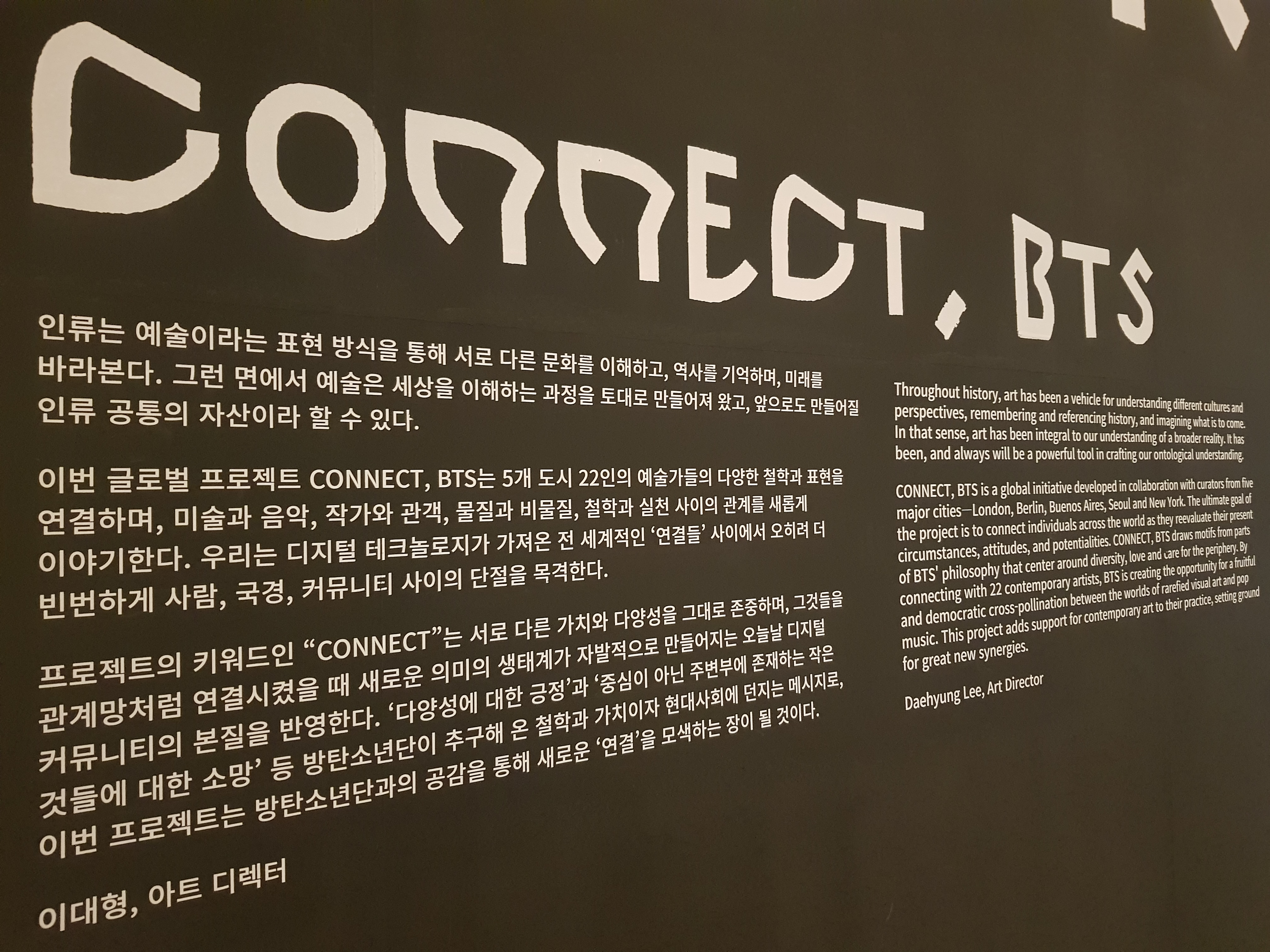 "CONNECT BTS"는 전세계 5개 도시에서 BTS의 예술 철학, 즉 '다양성'의 가치에 공감하는 큐레이터들이 참여한 공동 전시회 프로젝트입니다. 갤럭시 스마트폰 사용자를 위한 ‘증강현실(AR) 도슨트(전시해설사)’를 삼성전자와 방탄소년단이 함께 지원합니다.