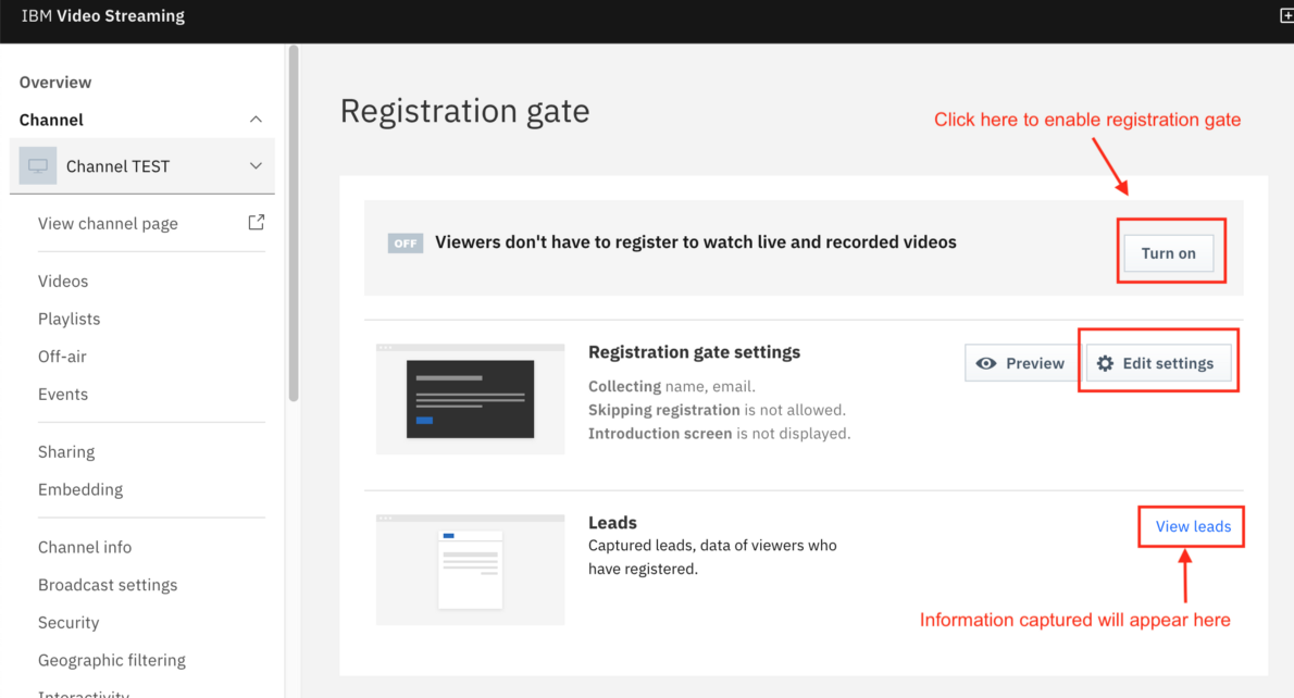 IBM Video Streaming 메인 페이지에서 Registration Gate 탭을 클릭하세요. Turn on 을 클릭하여 Registration Gate를 활성화 할 수 있습니다.
