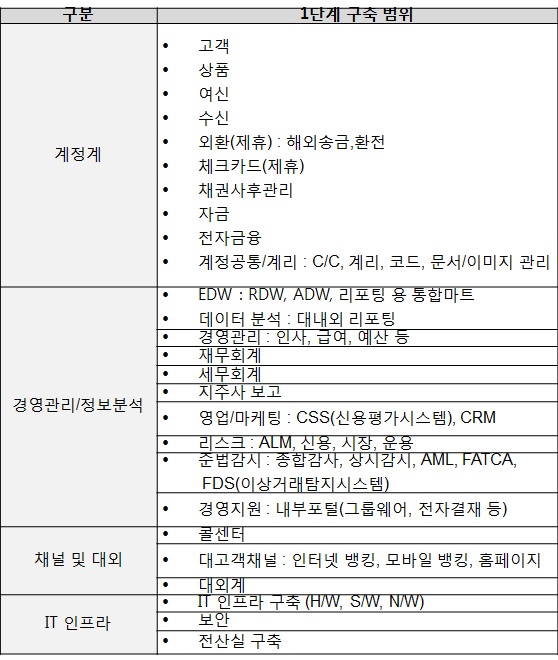 - 업무: 모바일 뱅킹, 인터넷 뱅킹, 현업의 단말기 데이터, 콜센터, 제휴 업체 정보 연계 등