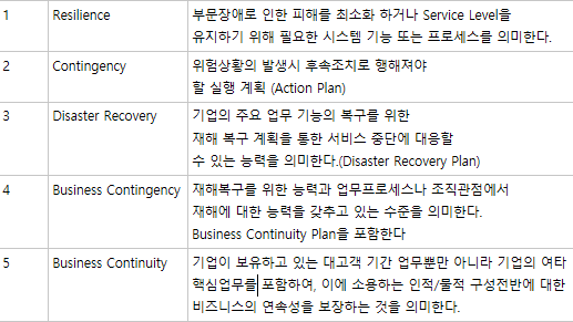 업무복구 및 재개 (Business Recovery & Resumption), 비상계획 (Contingency Planning) 등을 포함합니다.
