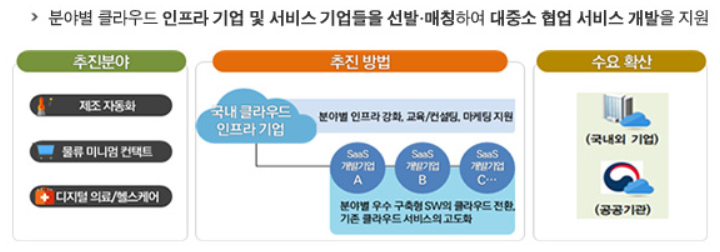 하반기 추경을 통한 5개 분야의 과제 공모에 헬스케어 37개, 교육 29개 등 총 120개 과제가 제안되었으며, 중기부 사업과 연계해 추진하는 제조 플랫폼을 제외한 4개의 플랫폼 개발 과제와 63개 서비스 개발 과제가 선정되었습니다. 이번 사업의 플랫폼 개발에는 KT, NBP, NHN 등의 국내 최고의 클라우드 기업이 참여하고, 서비스 개발은 모두 중소기업이 주도해 국내 클라우드 산업의 대·중·소 협력에도 기여할 것으로 기대됩니다. 이번 사업을 통해 성공적으로 개발되는 클라우드 서비스는 아래의 ‘클라우드 이용 바우처 사업’과 연계하여 활용할 수 있도록 지원할 계획이라 합니다.