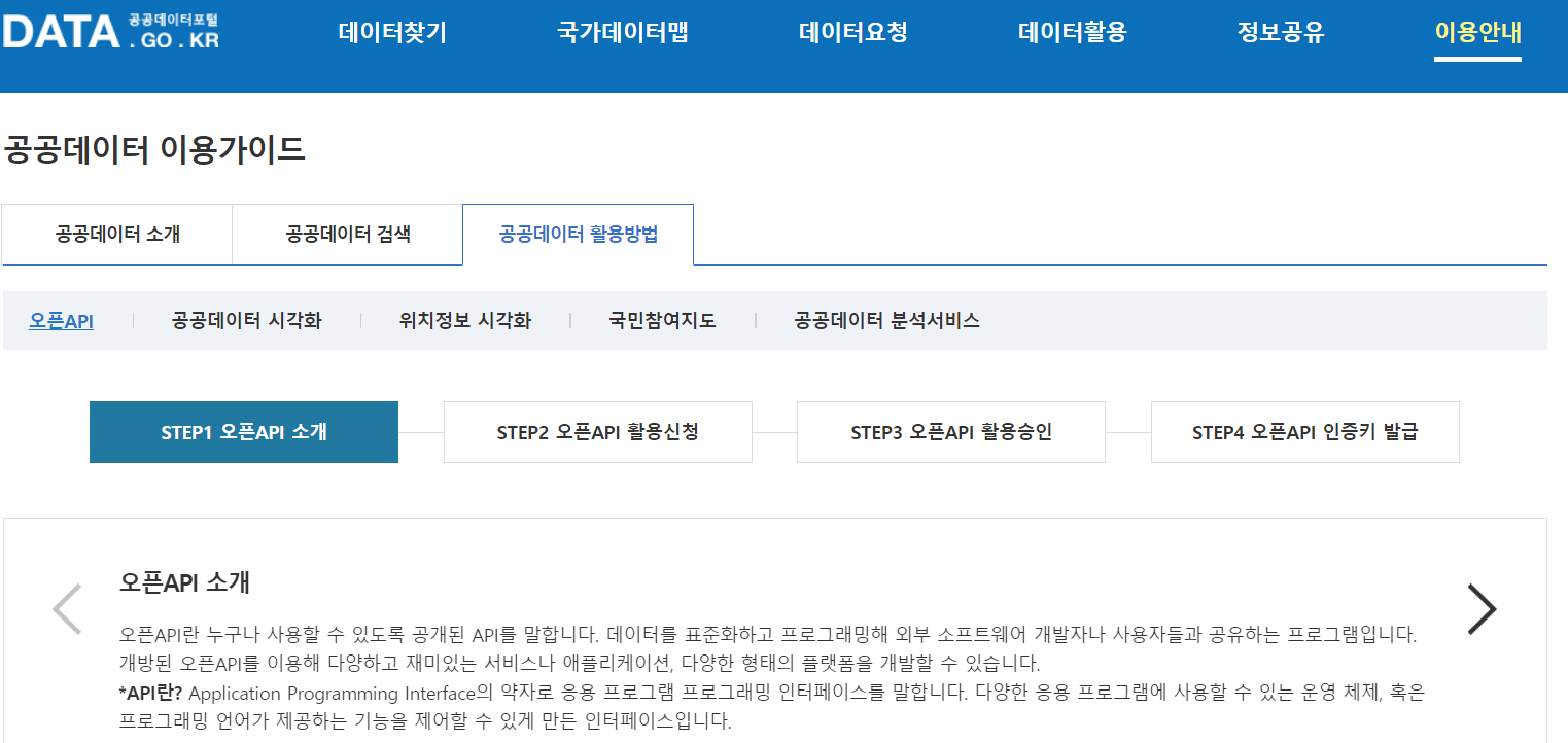 대표적으로, 정부는 공공데이터포털(www.data.go.kr)을 통해 국가기관이 보유한 수많은 데이터를 API 형태로 무료 공개하고 있습니다. 지역별 코로나 발생현황, 서울시 따릉이 이용현황, 미세먼지 측정 정보 등 다양한 데이터를 전 국민이 자유롭게 가져다가 데이터 분석을 수행하거나 유익한 서비스를 개발하는 데 쓸 수 있도록 적극적으로 장려하는 것이죠.