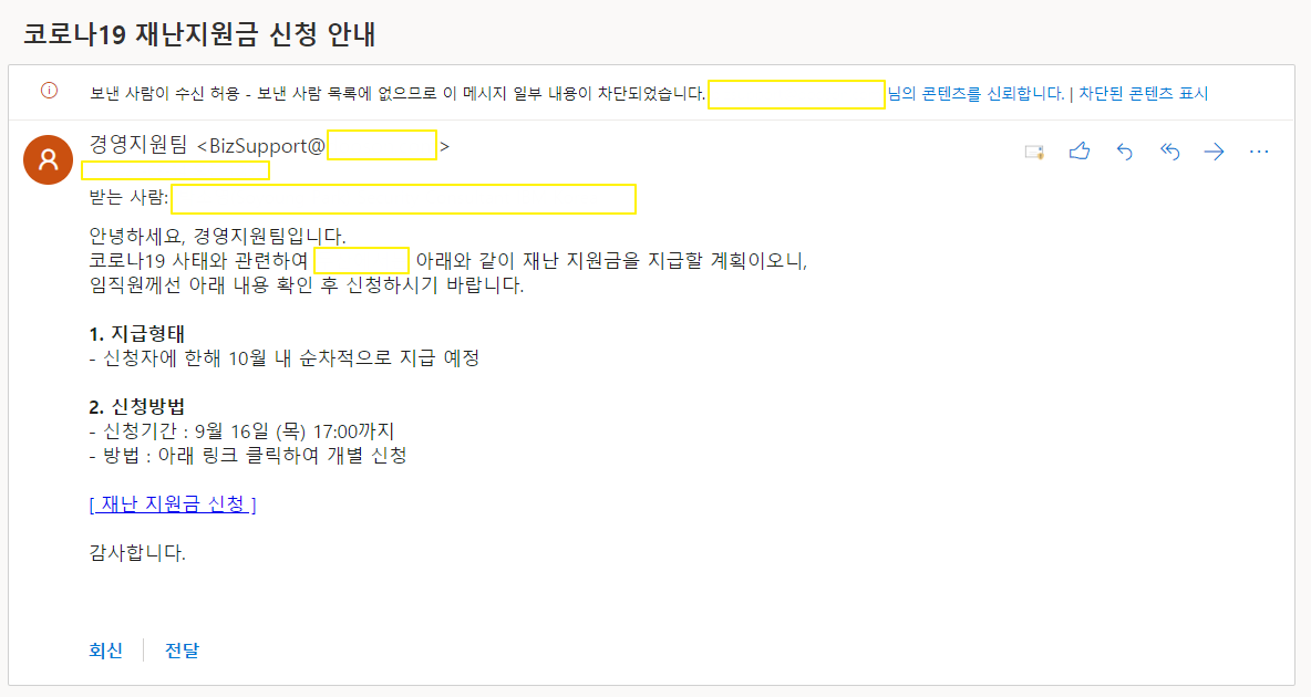 코로나 이후로는 재난지원금을 이용한 피싱 수법도 추가되었습니다. 특히나 본인이 본인이 재난지원금 지급 대상에 해당되지 않음을 인지하고 좌절하고 있는 사람들에게 "특별한" 재난지원금이 지원된다고 하면 혹시나 하면서도 유혹에 넘어가기 쉽죠. 맞춤 공격에서 조금 더 나아가, 사람들의 심리를 이용하는 방식이 된 것이죠.