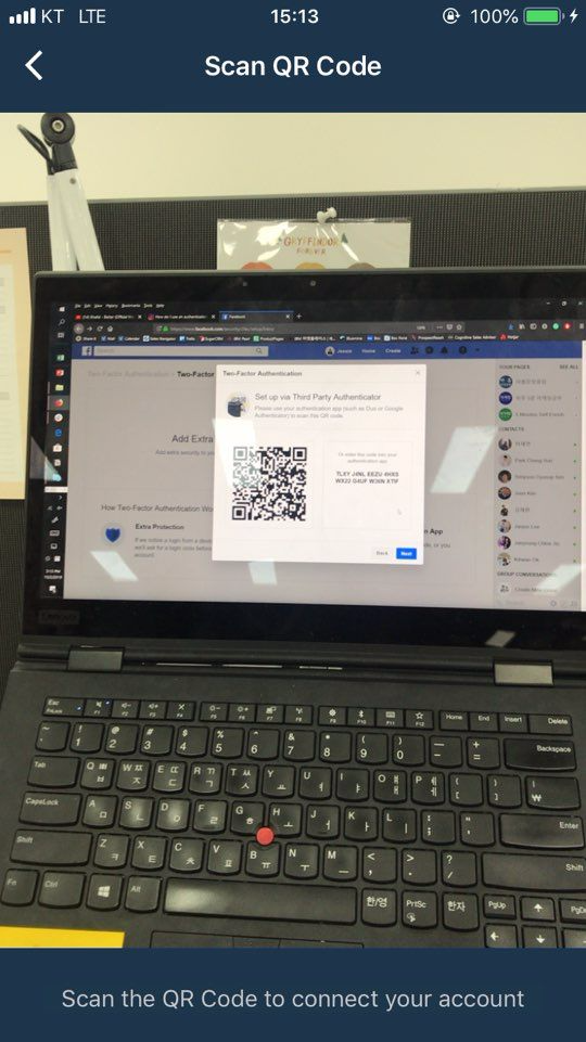 c.f. ํ์ด์ค๋ถ๊ณผ ๊ฐ์ด QR ์ฝ๋ ์ค์บ์ผ๋ก ๊ณ์ ๋ฑ๋ก์ ์ง์ํ๋ ๊ฒฝ์ฐ Scan QR Code๋ฅผ ์ ํํ ํ ํ์ด์ค๋ถ 2FA QR ์ฝ๋๋ฅผ ์ธ์์์ผ์ฃผ๋ฉด ๋ฐ๋ก ๊ฐ์ ์ด ๊ฐ๋ฅํฉ๋๋ค.