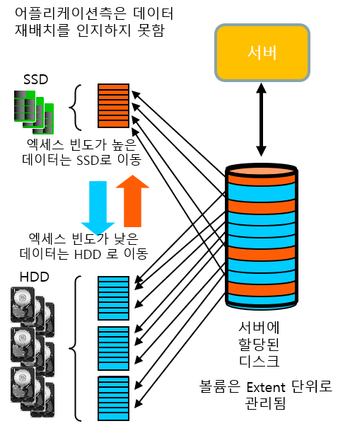 - 오토 티어링 - 스토리지 컨트롤러에서 서버에서 스토리지 내에 분포된 데이터의 물리적인 접근 빈도를 분석해 접근이 자주 발생하는 데이터는 SSD로 이전시켜 성능을 개선하여, 그렇지 않은 데이터는 SATA 디스크로 내립니다.