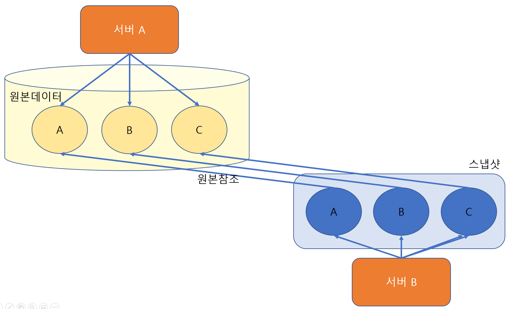 스냅샷이란 원본데이터를 가리키는 주소값만 갖는 포인터와 변경 이력만 관리하는 개념입니다.