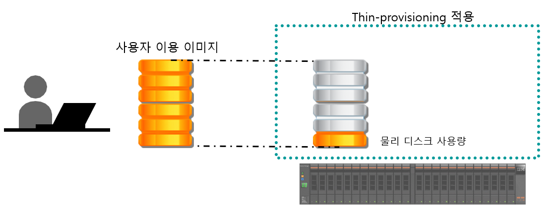 - 씬프로피저닝 - 가상의 스토리지 용량을 사용자에게 할당해주고, 실제로 사용할 때마다 용량을 할당해주는 방법입니다.