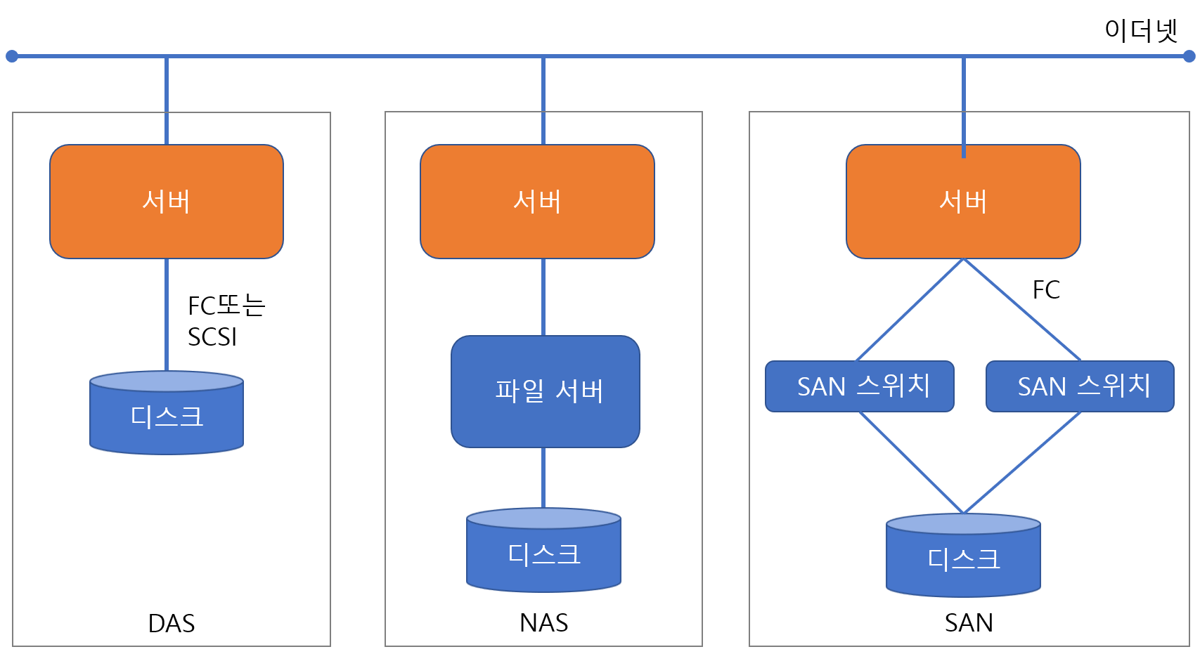 | NAS | 서버와 스토리지 사이에 스위치가 들어가며 네트워크 케이블로 구성되는 형태 | 확장성이 뛰어남 낮은 가격으로 고효율 낼 수 있음 |