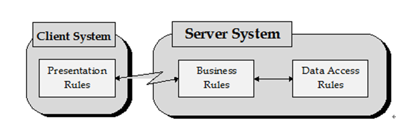 2 티어 클라이언트/서버 구조는 네트웍의 발전과 PC와 단말이 보급화되면서, 기존의 더미 터미널이 할 수 없었던 기능을 클라이언트로 이동한 방식을 말합니다. 클라이언트는 기존에 서버가 수행하던 작업 중, 사용자와 인터페이스 하기 프레젠테이션 계층(Presentation Rule), 애플리케이션 계층 (Business Rule), 그리고 데이터 계층(Data Access Rule) 시스템으로 구성하게 되었고, 서버 시스템은 주로 데이터를 관리하는 작업을 맡게 되었습니다. 1티어 방식과 가장 큰 차이는 클라이언트와 서버가 물리적으로 서로 독립된 시스템에 존재하게 되었다는 것입니다.