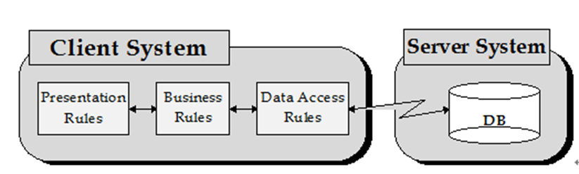 1 티어 클라이언트/서버 구조는 서비스를 제공하는 서버를 업무별로 나누지 않고 통으로 하나의 시스템으로 묶은 구조라고 생각할 수 있습니다. 사용자와 인터페이스 하는 프레젠테이션 계층( Presentation Rule), 애플리케이션 계층(Business Rule), 그리고 데이터 계층(Data Access Rule)을 하나의 서버 시스템에서 수행하는 방식입니다.