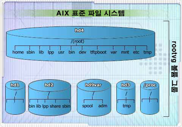| 루트(/) | /dev/hd4 | 루트(/) 파일 시스템은 논리 볼륨 /dev/hd4에 마운트 됩니다. 이는 계층 파일 트리의 맨 위에 위치합니다. 루트 파일 시스템은 부팅을 위한 디바이스 정보와 프로그램을 포함하며, 시스템 운영을 위해 중요한 파일과 디렉토리를 포함합니다. 다른 기본 파일 시스템의 마운트 포인트는 이 파일 시스템 하부에 위치합니다 |