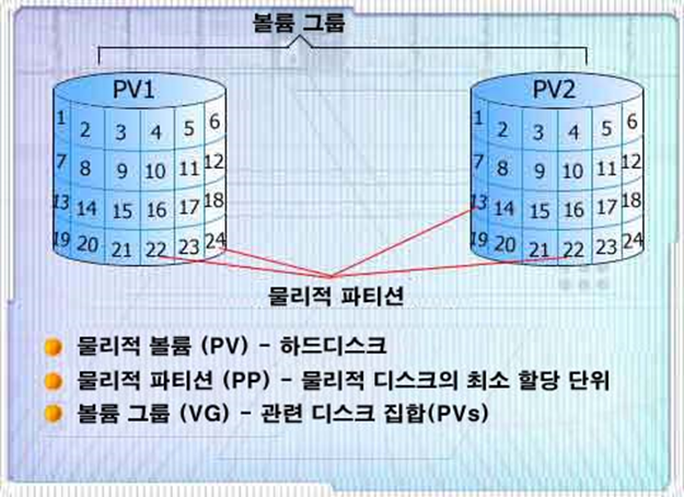 상용 유닉스 중 AIX에서는 논리적볼륨관리자(LVM)라는 관리시스템으로 전통적인 유닉스 디스크 저장장치의 문제점을 해결했는데요, LVM은 디스크 공간을 논리적 레벨에서 관리합니다. 논리적 공간과 물리적 공간을 연결함으로써 비연속적인 공간에 데이터를 저장하고, 다수의 디스크에 걸쳐서, 복제하고, 동적으로 공간을 늘리며 하드 디스크를 관리합니다.