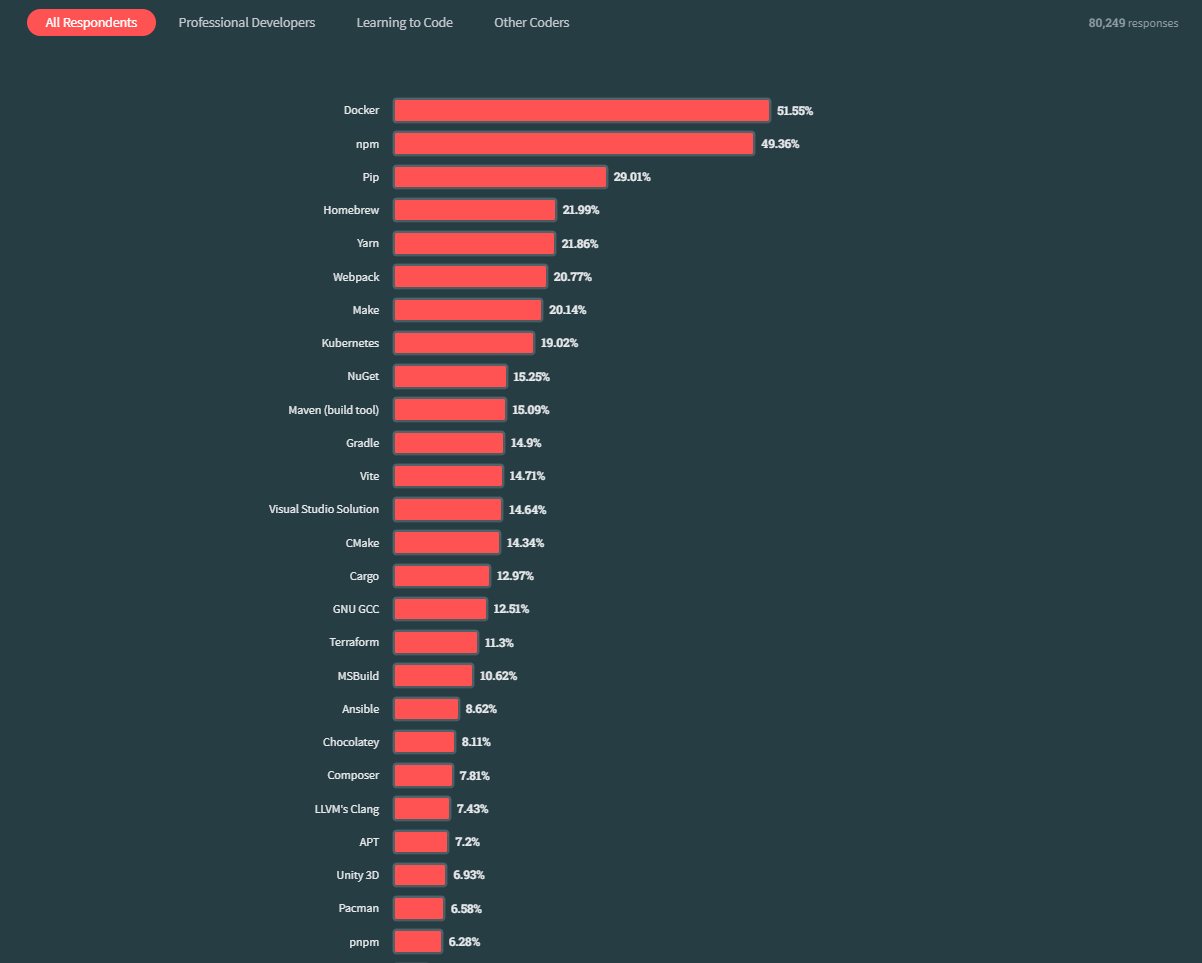 - Webpack, Kubernetes, Make와 같은 기술도 상위권을 차지하였습니다.