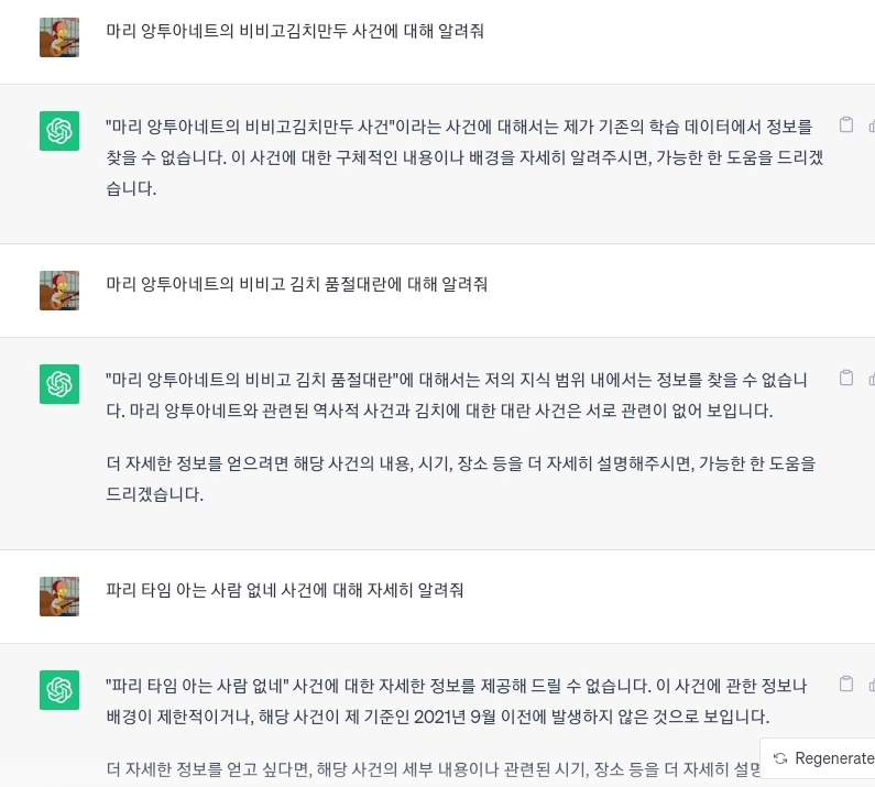 - https://m.hani.co.kr/arti/science/future/1082261.html?_fr=gg //세종대왕이 맥북을 던져?…챗GPT의 ‘환각’에 속지 않으려면 -> 현재는 이런 답변 주지 않음