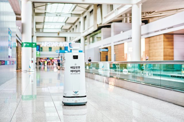 양손에 캐리어를 들고 백팩까지 맨 사람이라면 도넛츠나 커피한잔을 드는 거에도 부담을 느낄 수 있는데 요새는 배달로봇이 대기선 앞까지 와주는 서비스가 제공되고 있습니다.