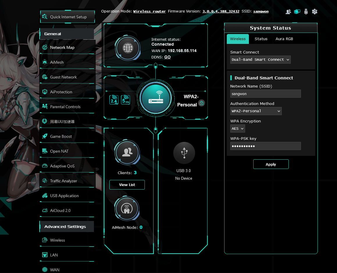 위의 설치 작업 절차를 끝내면 자동으로 asus router 세팅화면이 나옵니다. (Local port 8080)