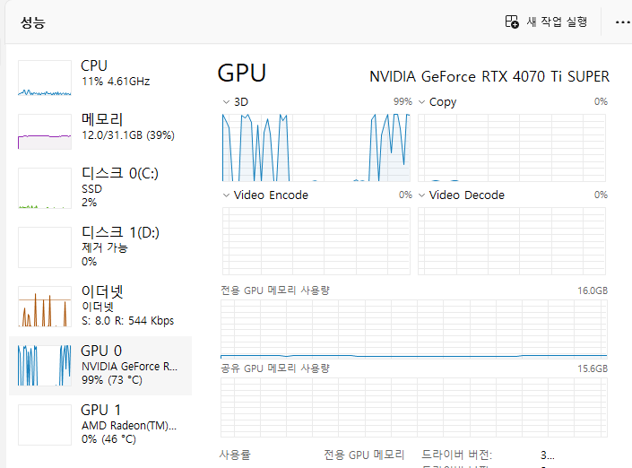 작업을 돌리는것만으로 그래픽카드의 온도가 30도 가까이 올라갑니다.