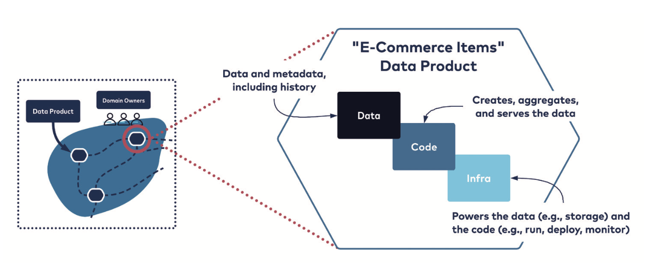 대부분의 기업들은 대체로 데이터 팀이 주관해 데이터를 관리하고, 필요한 데이터가 있을 때마다 데이터 팀에게 요청해 관련한 데이터나 분석결과를 얻게 됩니다. 이런 형태를 중앙 집중형(central data team)이라고 부릅니다. 이와 다르게, 데이터 매쉬는 이전의 한 팀(functional team)에서 모두 데이터를 관리하는 것이 아닌, 데이터 소유권을 각 도메인(team, business unit)으로 분산시켜, 개별 도메인이 자신의 데이터를 책임지고 관리하며, 데이터를 "제품"으로 취급하는 구조를 의미합니다.