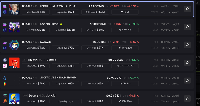 진화하는 암호화폐의 세계 속에서도 밈코인은 매우 눈에 띄는 존재다. 밈코인은 인터넷 밈(Meme), 즉 유행하는 개그나 문화적 현상을 기반으로 한 암호화폐로, 종종 재미있고 바이럴(viral) 한 테마를 가지고 있다. 밈코인의 기술적 메커니즘은 일반적인 암호화폐와 비슷하지만, 주제나 탄생 배경에서 차이를 보인다. 주로 온라인 커뮤니티의 문화적 요소를 반영해 만들어졌으며, 이러한 특성 때문에 젊은 세대, 특히 X와 같이 온라인 커뮤니티 이용자들를 중심으로 큰 인기를 끌고 있다. 때로는 특정 사회적 이슈나 인물을 통해 주목을 받기도 했다. 대표적인 예로는 트럼프가 있을 듯하다. Donald 라는 단어만 쳐도 나오는 온갖 코인을 볼 수 있다…