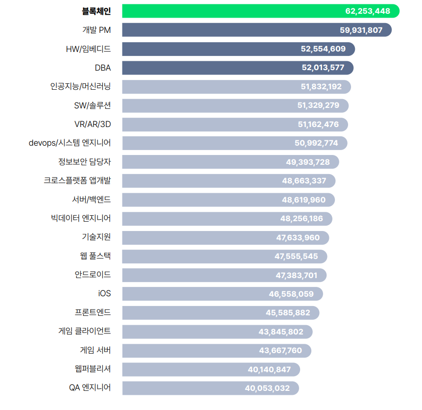 주니어 쪽도 블록체인이 1등입니다. 저의 의견을 제시하자면 블록체인은 지금 하나의 트렌드 산업이라 생각하고 원 달러 가치가 약세화되가는 중에 유망한 직군이라 생각이 됩니다. 다만 언제 골로 갈지 모르니 주의해야되는 부분이라 생각하고 당연하게도 AI엔지니어 + Quantum Computing Engineer 이 두가지 직군이 인제 엄청나게 빠르게 뛰어오를 것 이라 생각합니다. 거의 확신합니다. 이 글을 보고 있다면 이 2개로 성공해서 저에게 커피사주십쇼