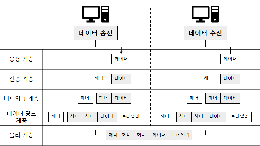 데이터 송신 시 각 계층에서는 전 계층에서 넘어온 데이터 앞에 전송에 필요한 추가적인 정보들을 덧붙입니다. 이때 덧붙이는 정보를 헤더라고 하고, 헤더를 붙이는 것을 캡슐화라고 합니다. 반대로 수신 시 각 계층에서 대응되는 계층의 정보를 벗겨내는데, 이를 역캡슐화라고 합니다.