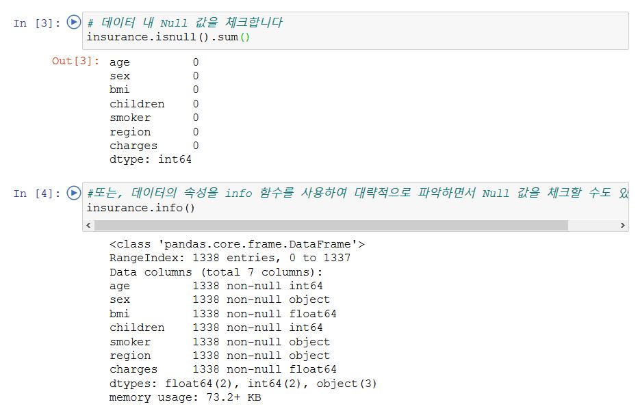 데이터를 불러온 후 Null 값을 체크합니다. isnull().sum() 또는 .info() 함수를 사용합니다.