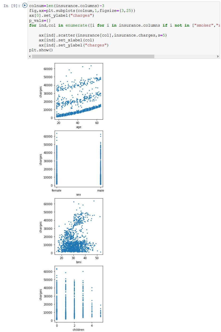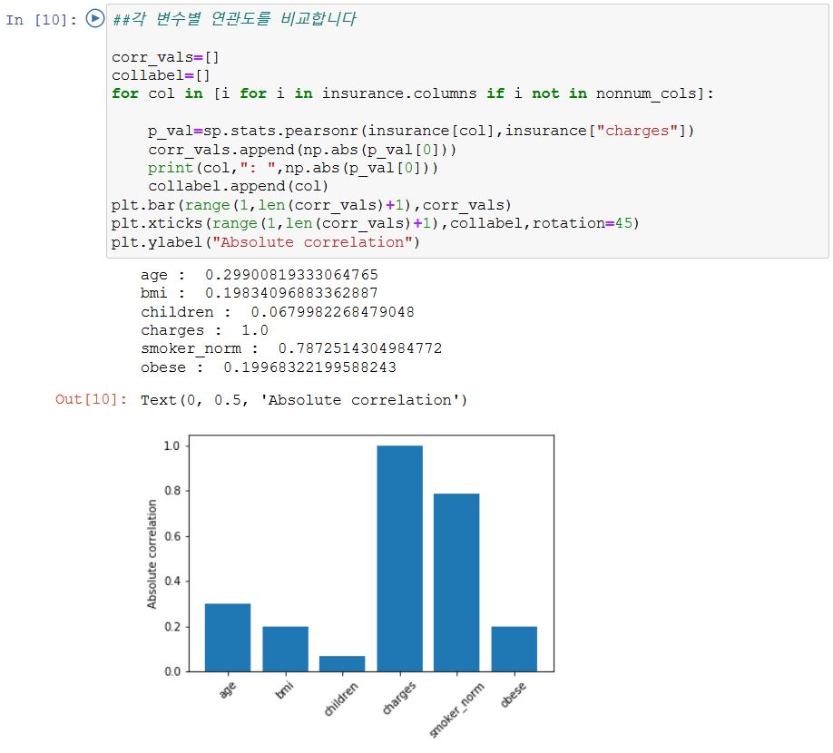 각 feature들과 보험 가격의 개별 연관성을 p value로 측정합니다. matplotlib.pyplot 라이브러리를 활용해서 시각화할 수 있습니다.