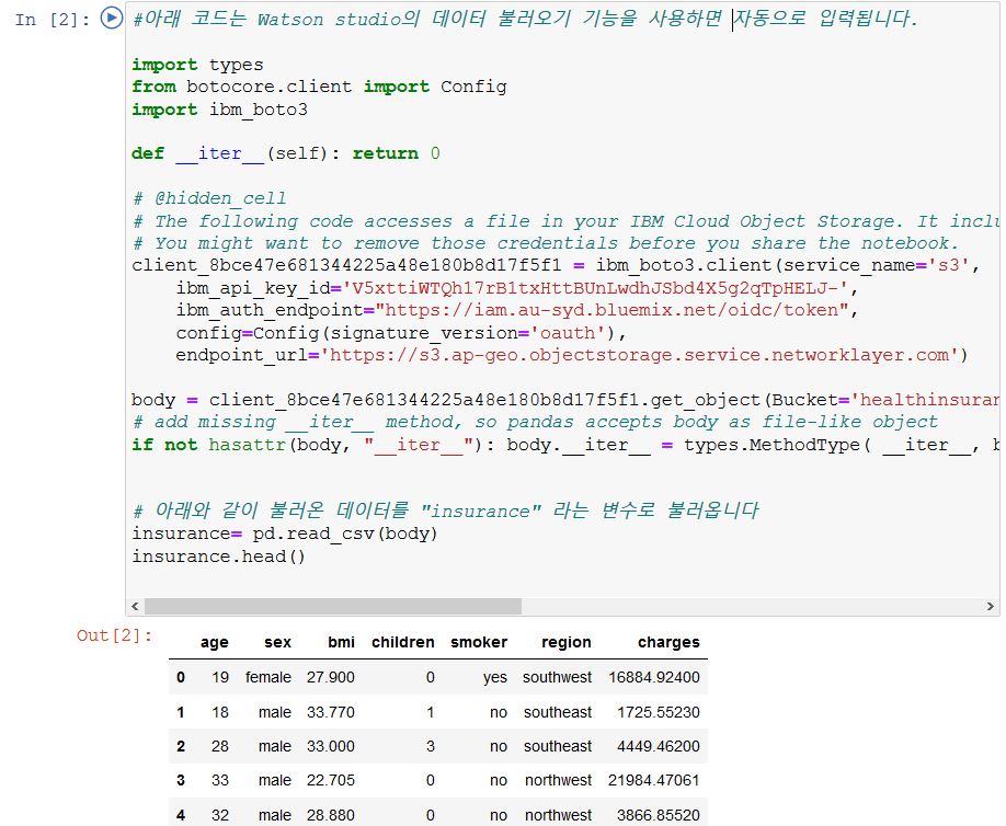 샘플 데이터를 불러옵니다. 일반적인 Juypter Notebook을 사용하는 경우 pd.read_csv("../input/insurance/insurance.csv") 명령어로 가능하지만 Watson studio의 노트북을 이용한다 우 상단 10/01 아이콘을 선택하여 Find and Add Data 기능을 사용합니다. Files 탭 > browse 를 클릭하여 .csv 파일을 추가하세요.