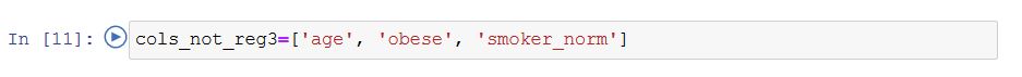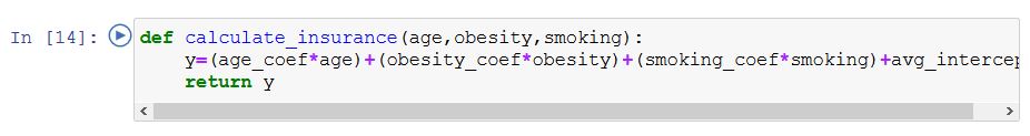 3개의 변수로 예측하기때문에 모델은 다중 선형회귀일 것으로 가정합니다. y = ax1 + bx2 + cx3 + i 의 방정식에서 y는 예측하고자 하는 값, 즉 개별 보험 가격이고 a 는 나이(age) 라는 변수 x1의 패널티, b 는 비만 여부(obese) 라는 변수 x2 의 패널티, c 는 흡연 여부(smoker_noun) 변수 x3의 패널티입니다. 이때 b와 c는 Yes or No를 의미하는 0 또는 1의 값만을 가집니다. i 는 간섭을 의미합니다.