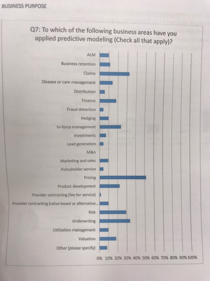 이러한 움직임의 일환으로 미국 계리사 협회 (SOA, Society of Actuaries)가 세계적인 보험 계리 서비스업체 밀리만 Milliman과 함께 이번 연구를 진행했습니다.현재 기업별로 예측분석을 받아들여 보험 업무에 적용하는 정도는 차이가 있습니다.